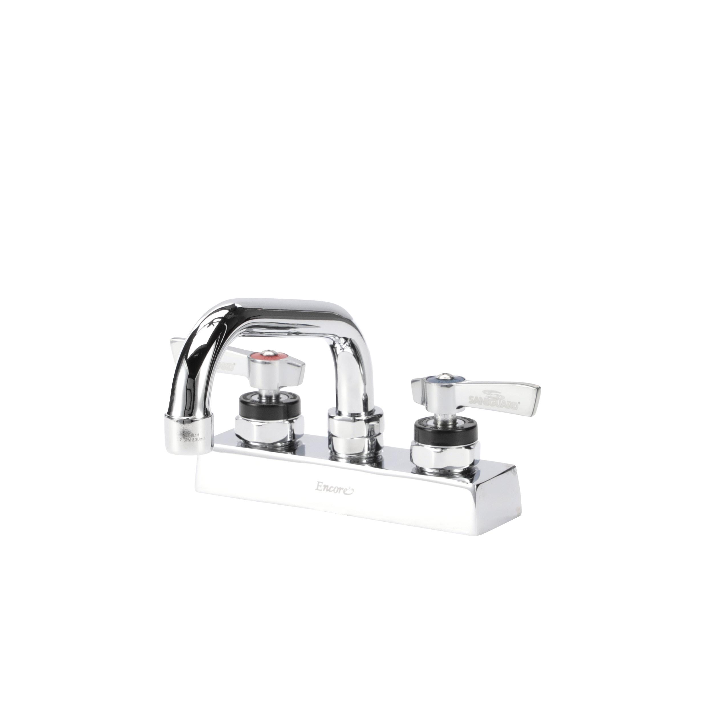 • Deck mount • 4" (102mm) O.C. inlets • 6" (152mm) stainless steel horizontal swing spout • 1/4-turn full volume ceramic valves • Lever handles • 2.2 gpm aerated stream aerator • Low lead compliant • NSF • Brand: Encore®