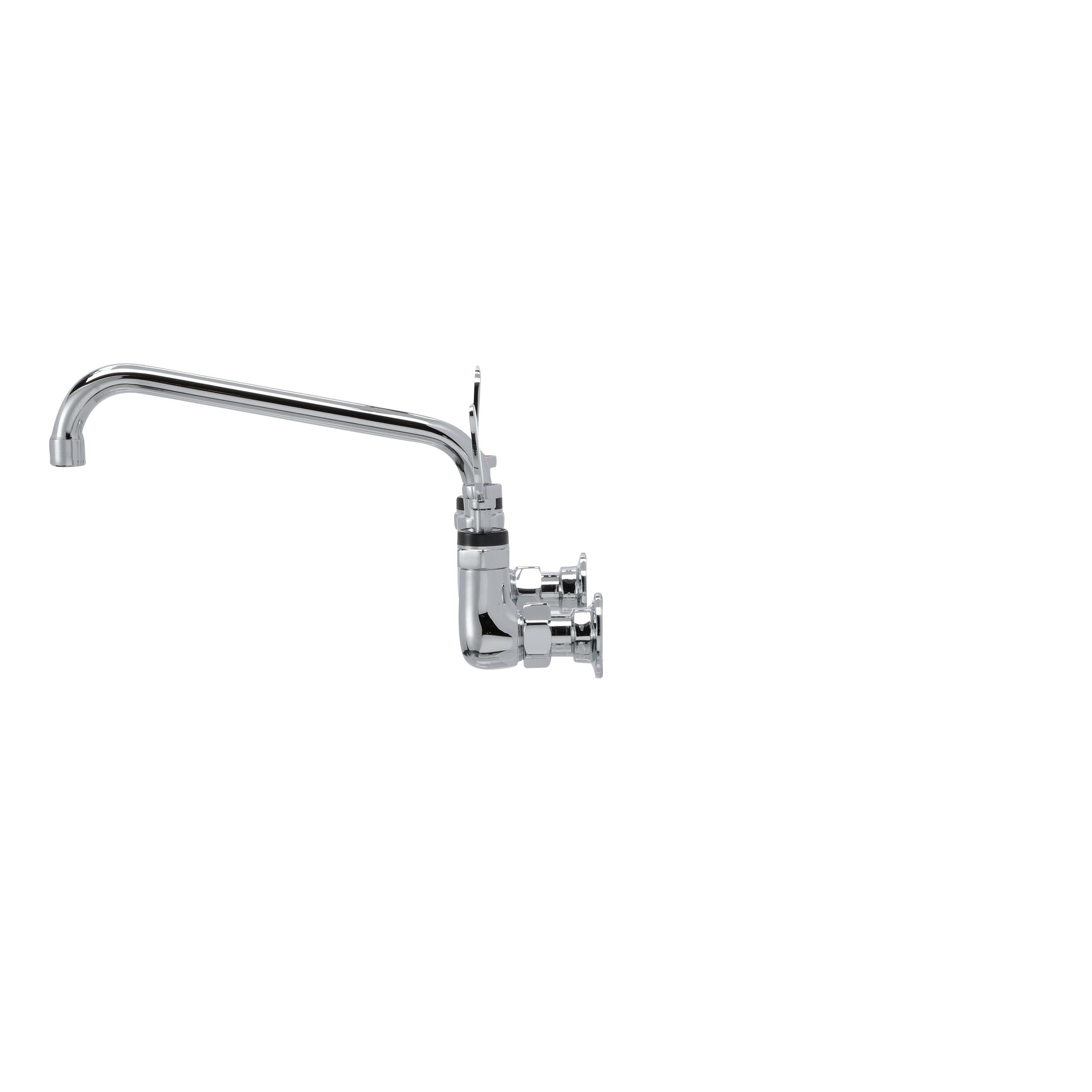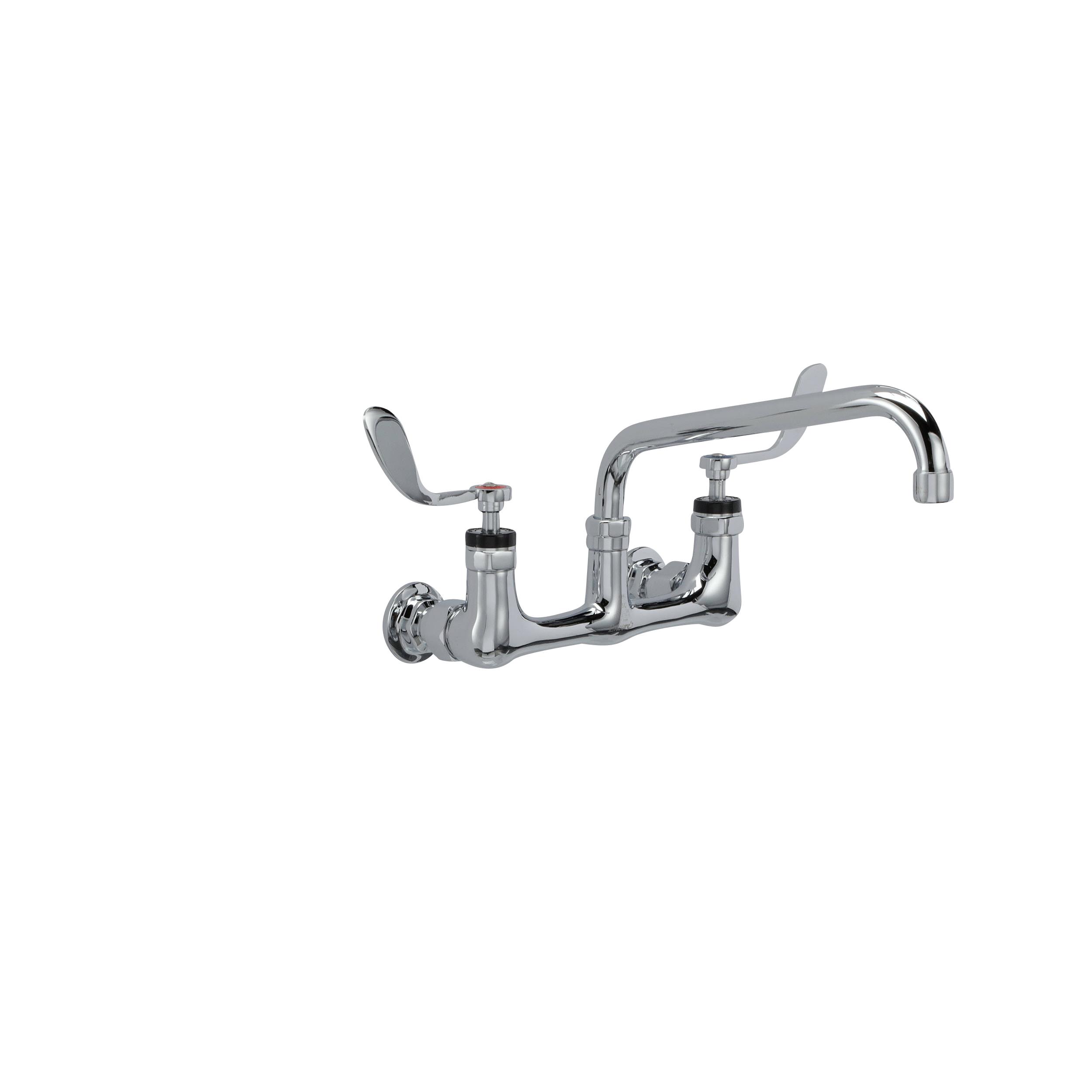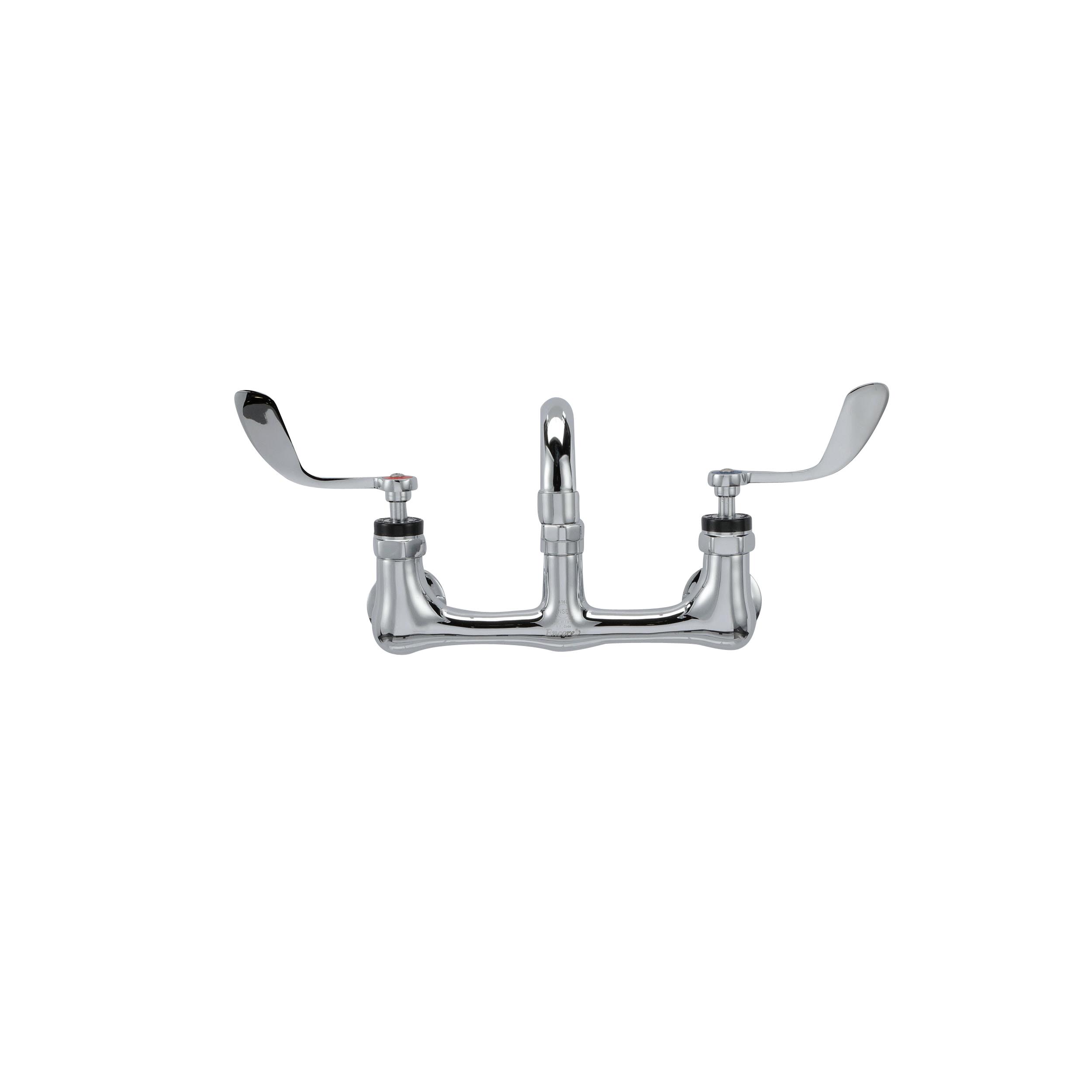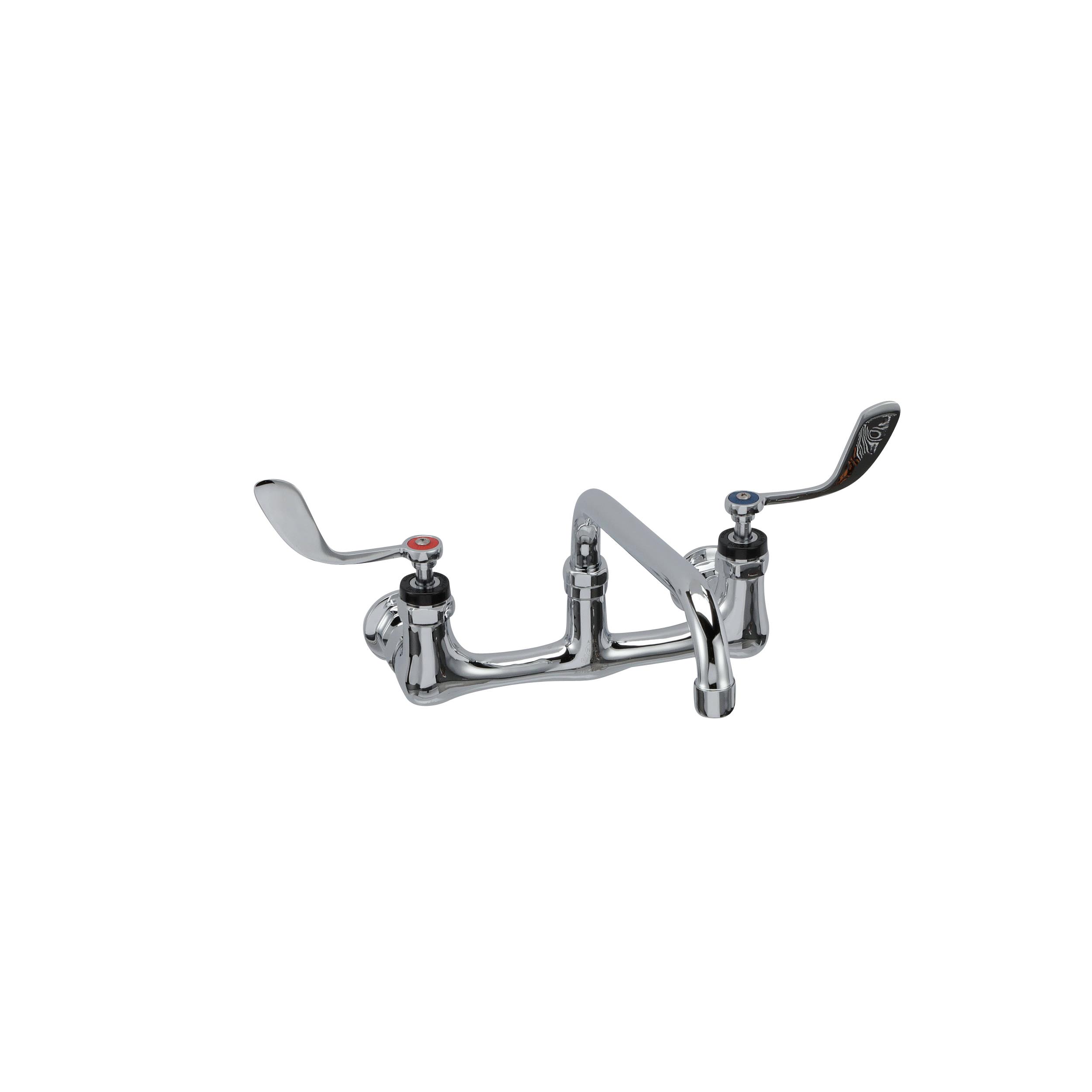 - Encore® 8" OC. Brass Chrome Plated Wall Mount Faucet with 8" Swivel Spout 4" Wrist Blade Handles, Retail Packaging