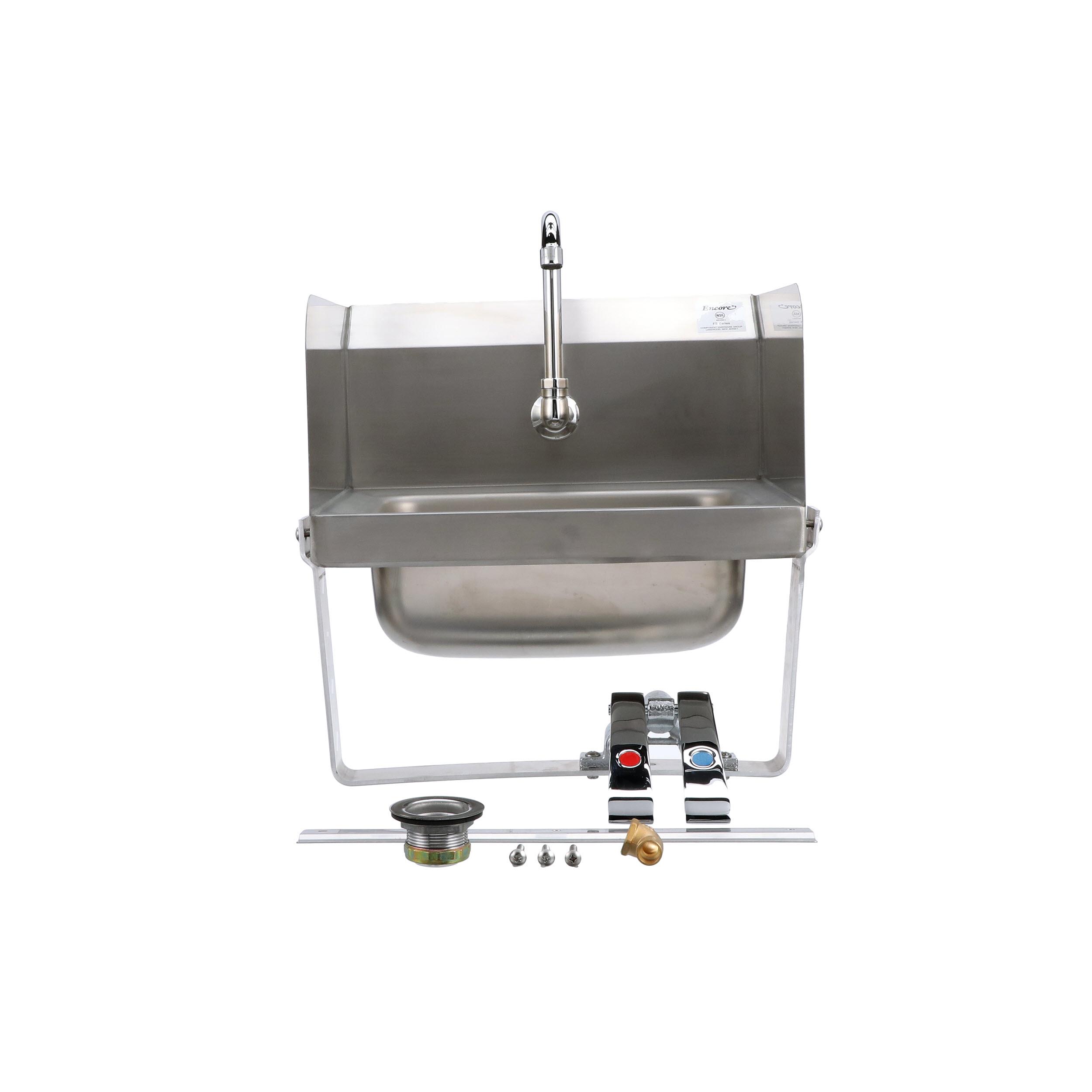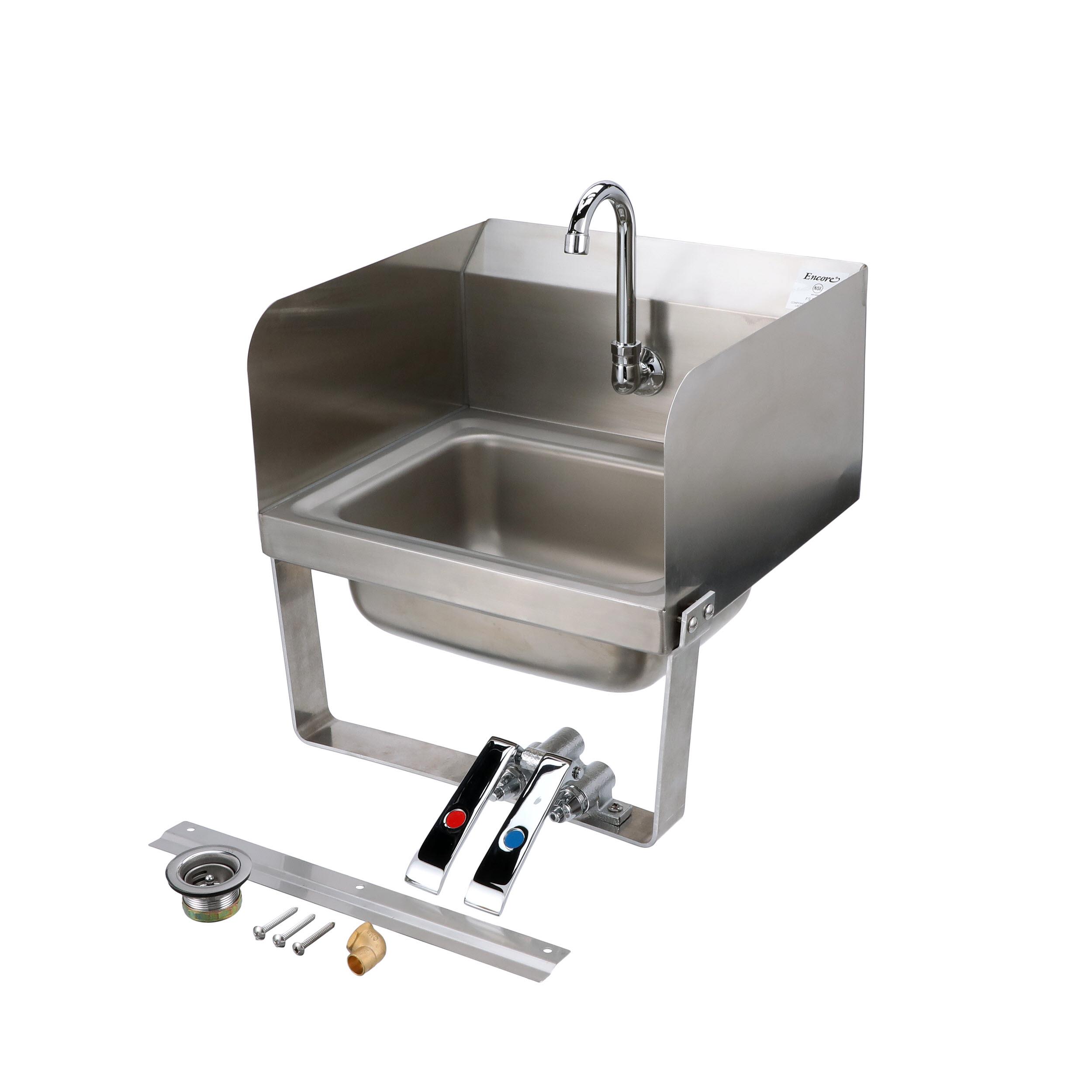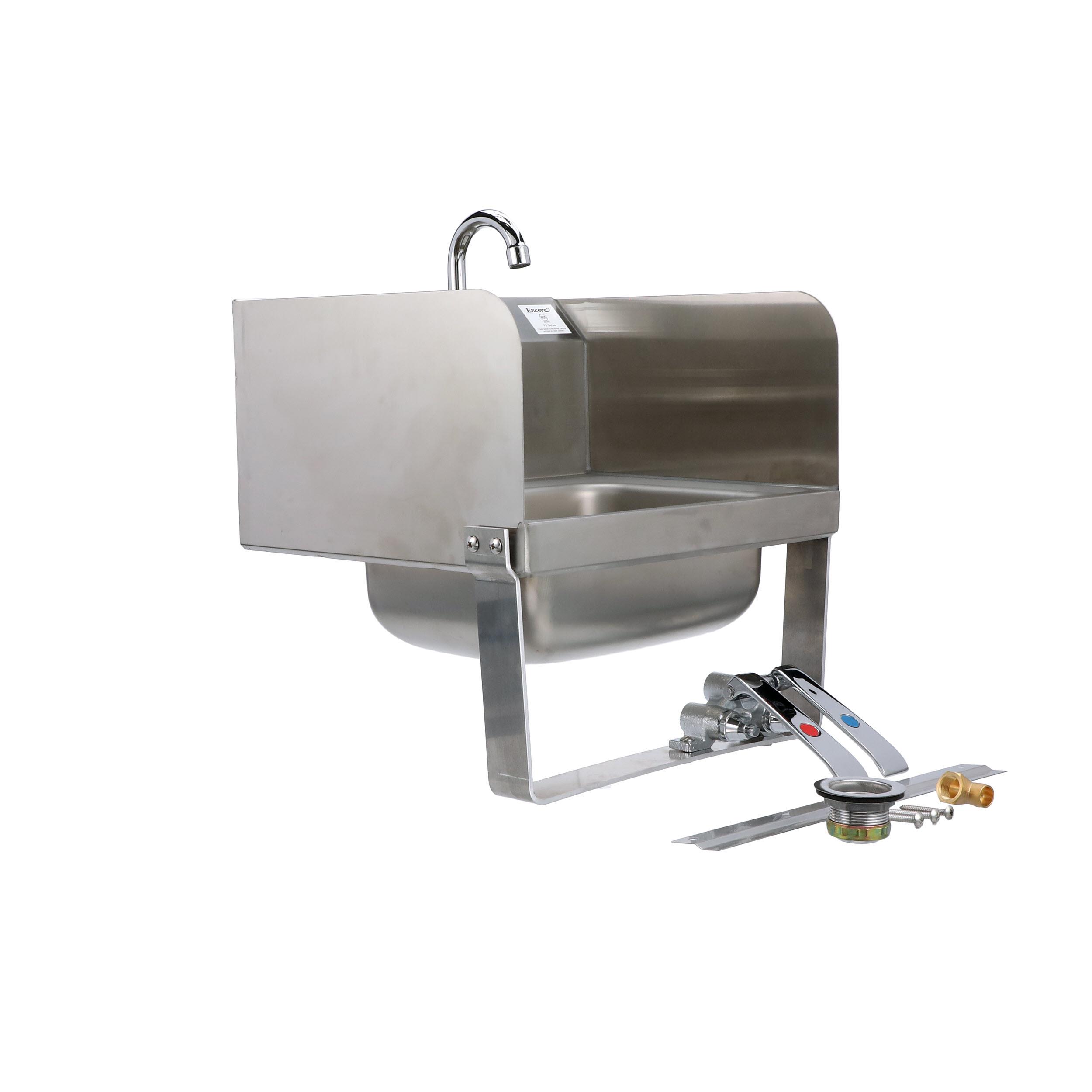 Encore Wall Mount Type 304 Series Stainless Steel Hand Sink 14" x 10" x 5" Deep with Single Hole, Double Side Splash, Dual knee valve with Gooseneck spout